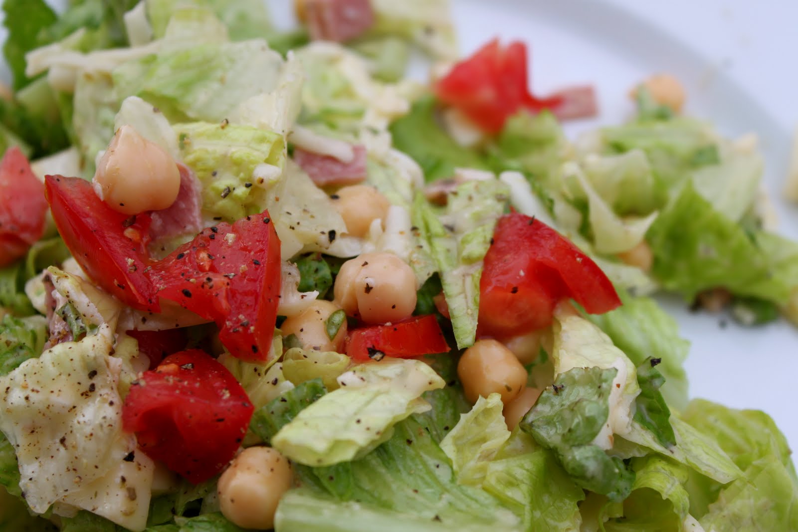 - To prepare salad: Combine chickpeas, iceberg lettuce, basil, mozzarella, chicken, salami, half of the tomatoes, half of the provolone and half of the green onions. Toss with dressing. (You may not need all of the dressing. Refrigerate any that remains.) Divide evenly among 8 lettuce-lined plates. Garnish with remaining tomatoes, provolone and green onions.