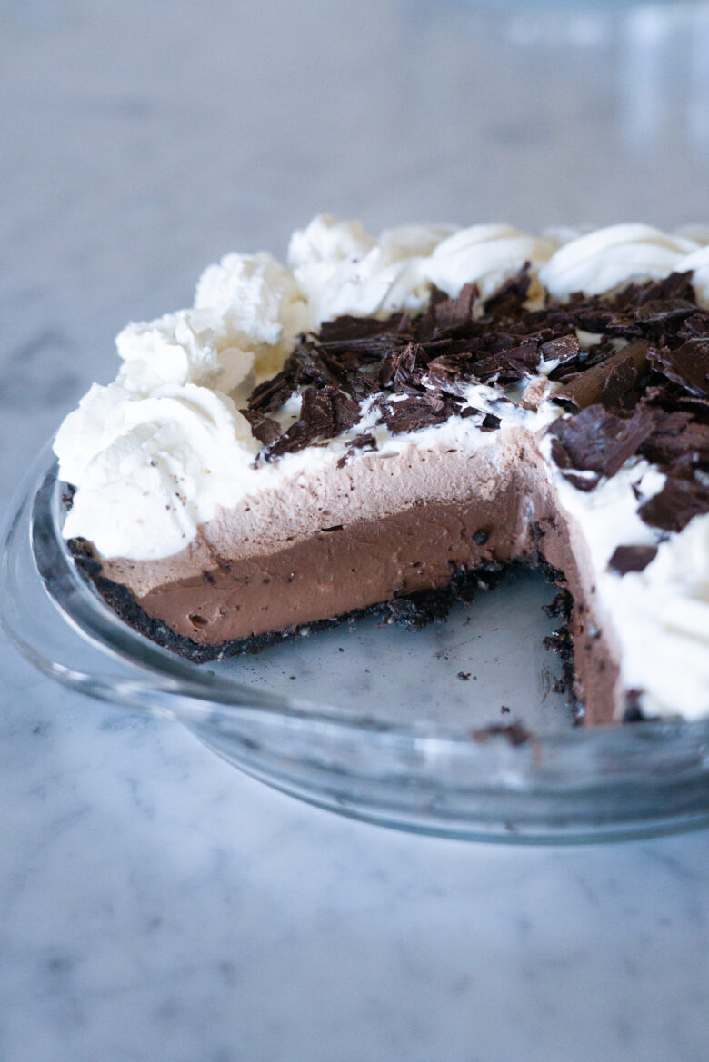 - When ready to serve, make the whipped cream topping. Whip the heavy cream, powdered sugar, and vanilla until soft peaks form. Spread the cream over the pie. If desired, top with chocolate shavings. Slice and enjoy!